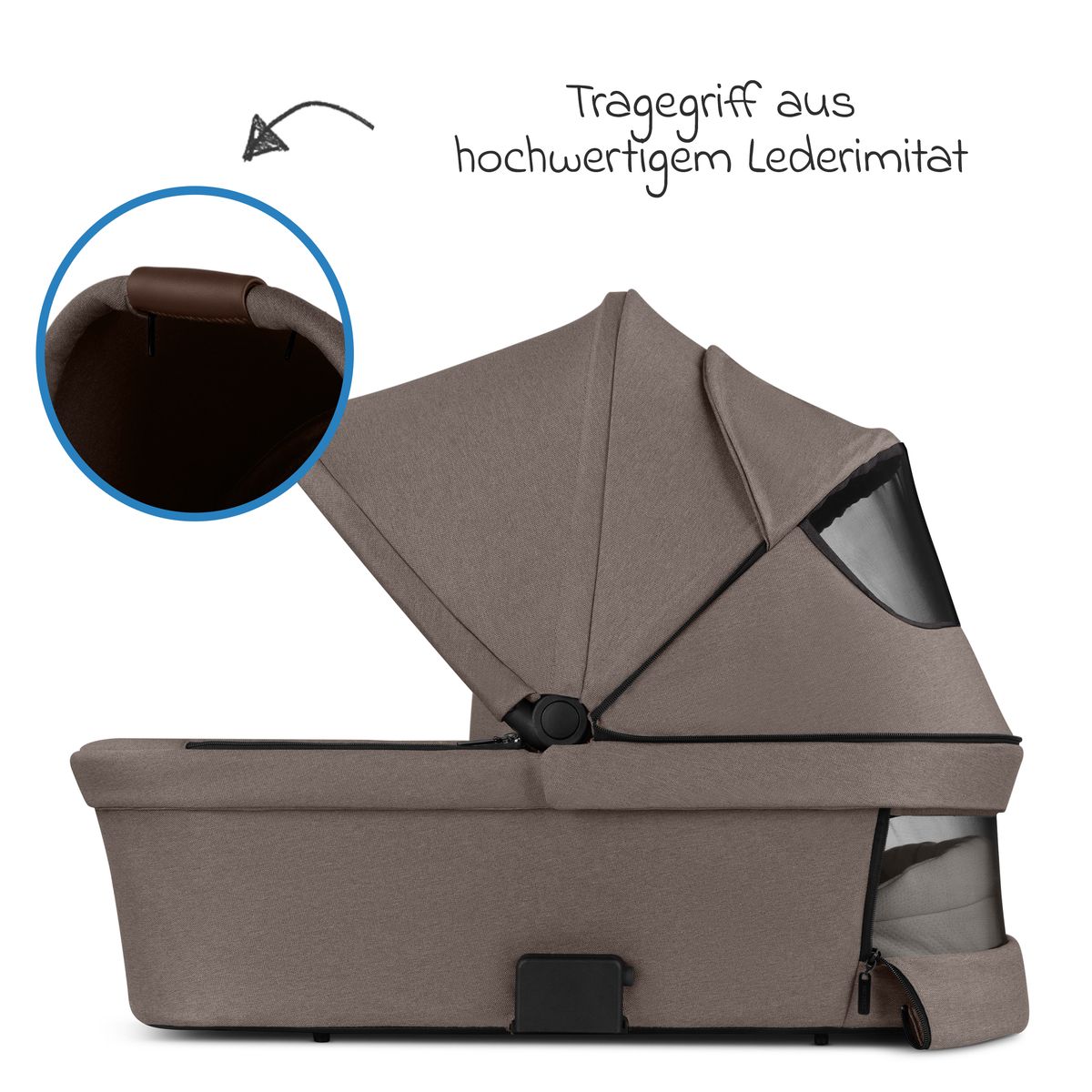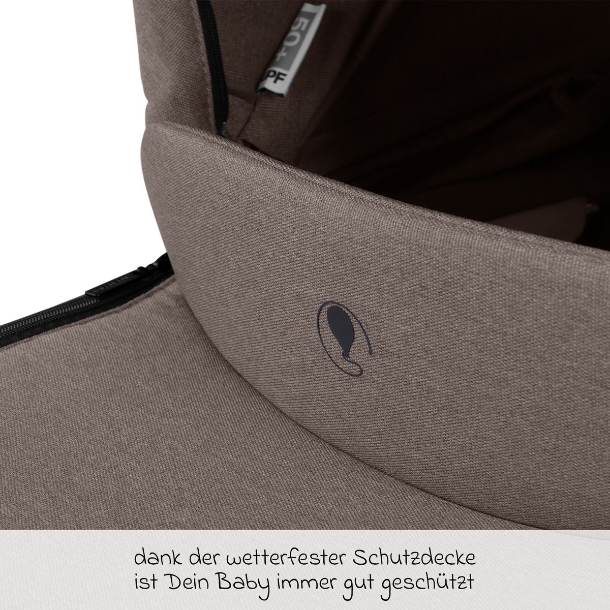 Il tuo bambino è protetto dalla copertina della navicella abbinata e da un'ampia capottina. La capottina è dotata di protezione UV 50+. Per le giornate più calde, c'è una finestra di ventilazione integrata (in rete particolarmente fine) sulla capottina e una all'estremità della testa della navicella. In questo modo la navicella è sempre piacevolmente ventilata e si evita l'accumulo di calore.
