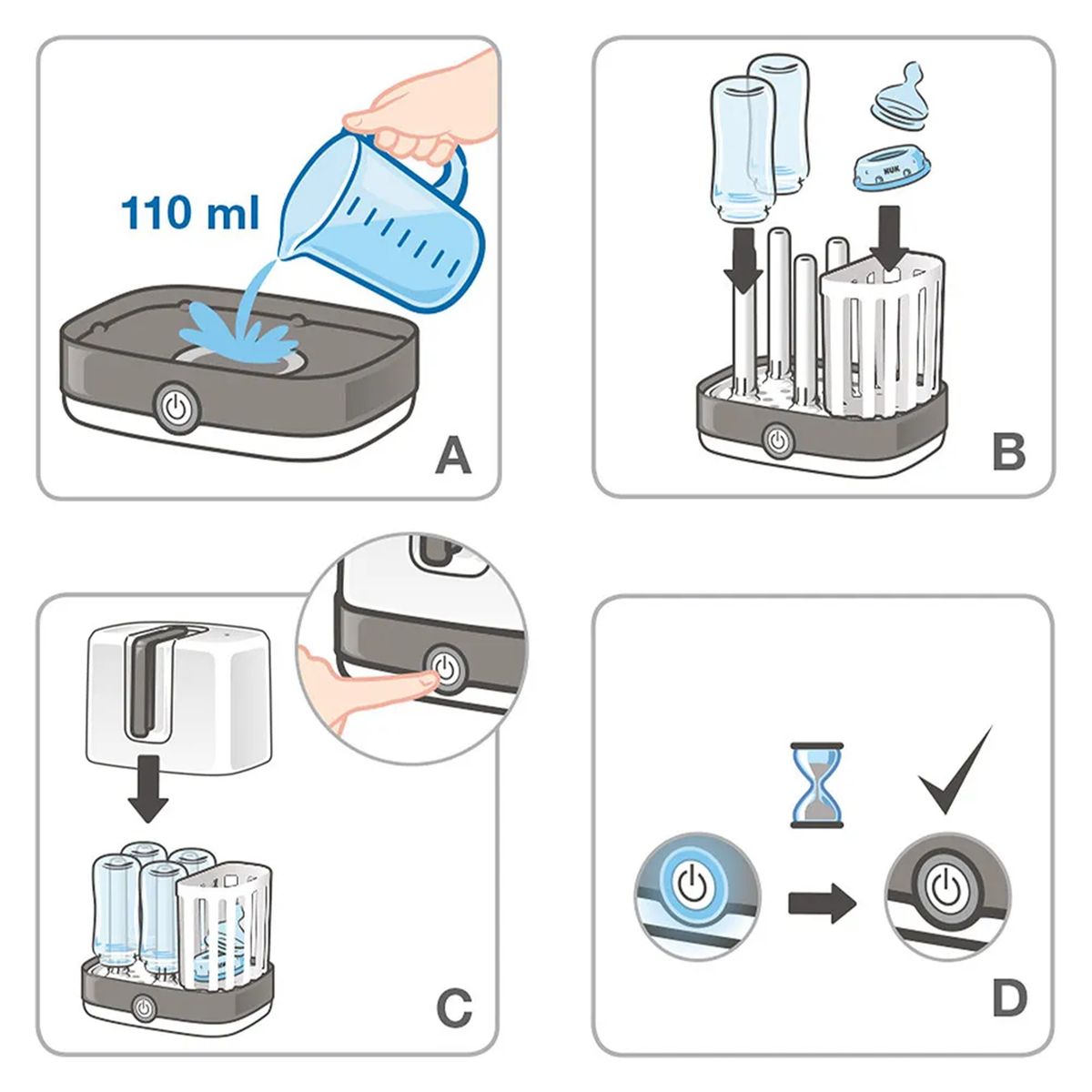 - Disinfezione super veloce e sicura di fino a 6 biberon e accessori in commercio in soli 6 minuti .