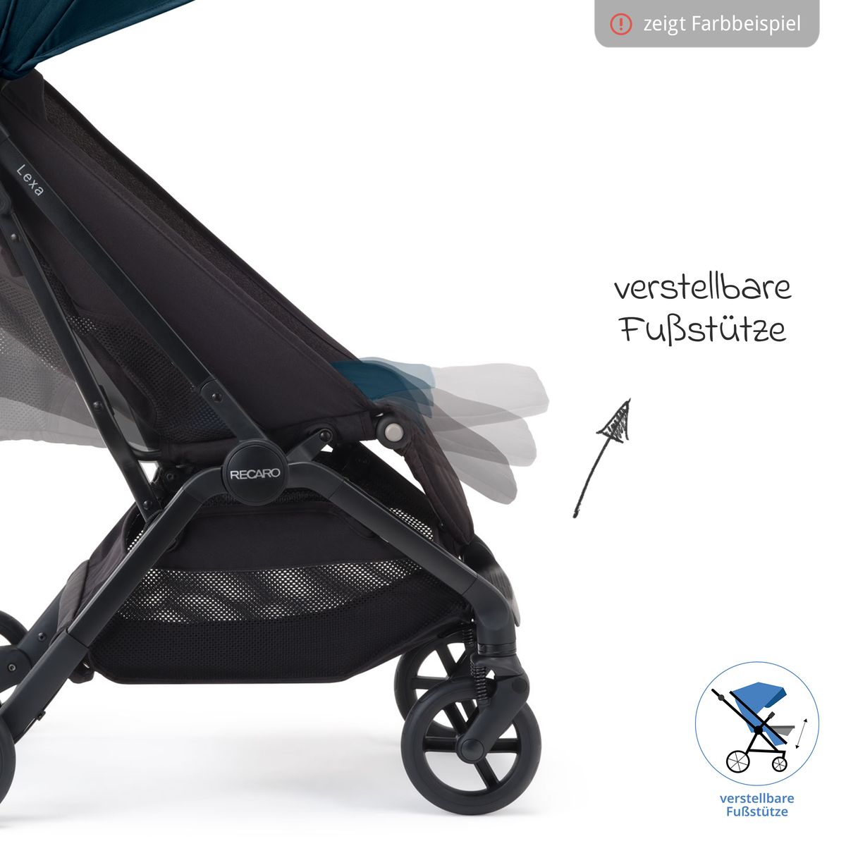 La Lexa è dotata di un sedile ben imbottito. I generosi inserti in rete permettono all'aria di circolare facilmente. Questo garantisce il comfort nelle giornate più calde. Ti permette di utilizzare il passeggino per brevi viaggi, anche per i bambini più piccoli. Lo schienale del sedile può essere reclinato in modo continuo per ottenere una posizione distesa e rilassata. Il bambino può appoggiare comodamente i piedi sul poggiapiedi. Una barra di sicurezza imbottita e il sistema di cinture a 5 punti assicurano una presa sicura del seggiolino.