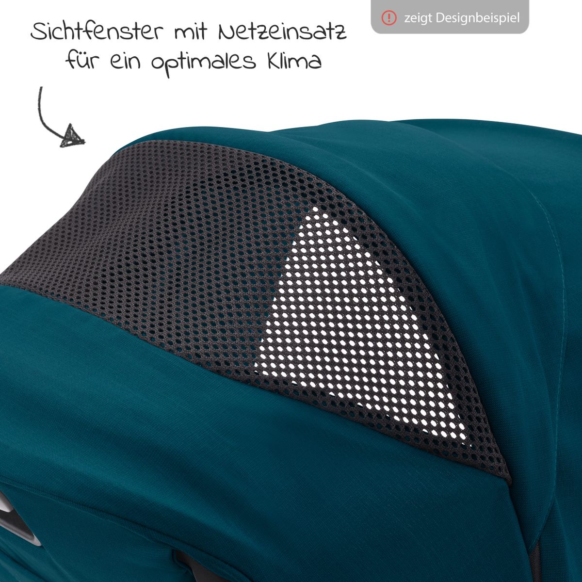 L'unità di seduta Sadena/Celona è dotata di una barra di protezione che può essere aperta su entrambi i lati. Il grande tettuccio XXL con protezione UV 50+ fa ombra all'interno. Puoi aprire la finestra incassata nelle giornate più calde. In questo modo l'aria circola ancora di più all'interno del seggiolino e il bambino è ben visibile.