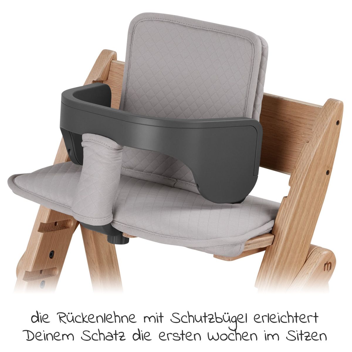 Das Rückenpolster kann zur Befestigung über die Rückenlehne des Starter-Sets gezogen und via Klettverschluss fixiert werden. Das Sitzkissen und das Polster für den Schrittgurt lassen sich ebenso einfach befestigen. Auf diese Weise sitzt das Set passend, so dass nichts verrutschen kann. Wird während der Mahlzeiten gekleckert, lassen sich alle Bezüge für eine Wäsche mit wenigen Handgriffen wieder abnehmen.