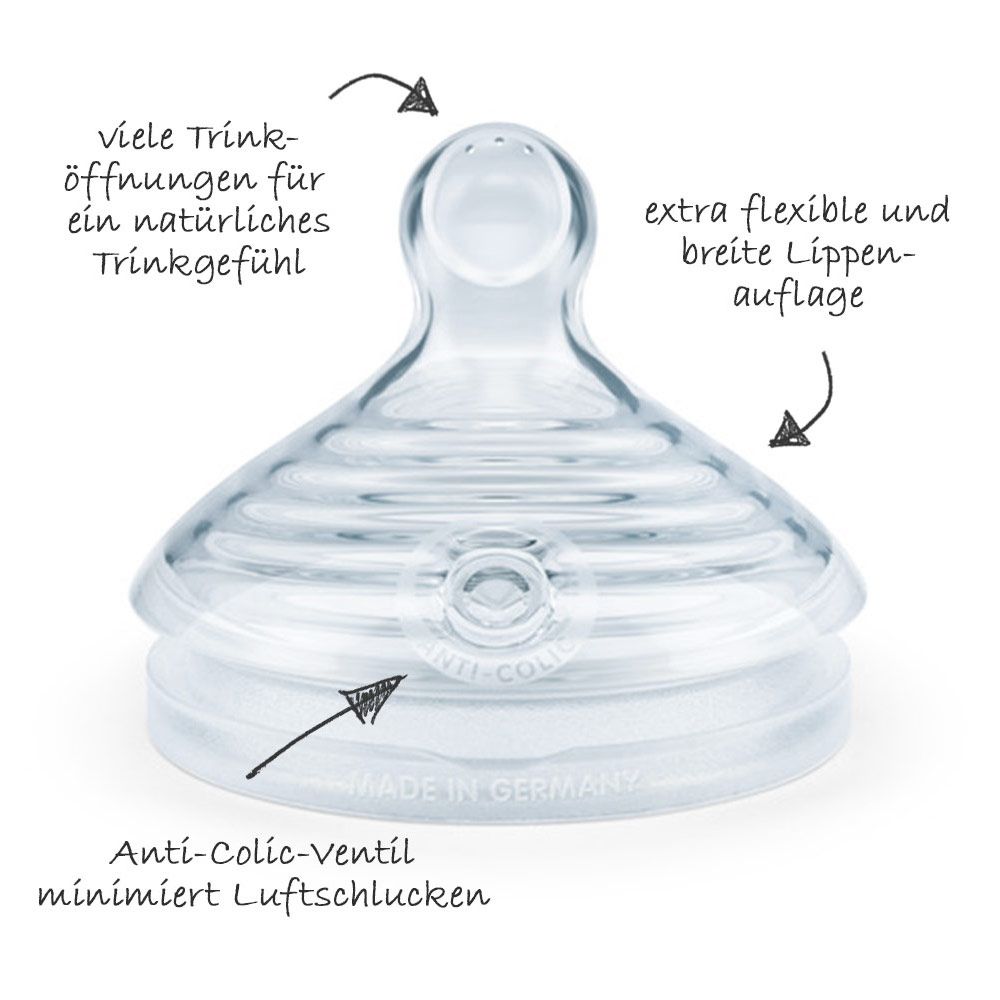 Der Silikon Trinksauger Nature Sense von NUK ist mit vielen superfeinen Trinköffnungen ausgestattet, die den Milchkanälen der Mutterbrust nachempfunden sind. Diese sorgen für einen ruhigen und natürlichen Trinkfluss. Die besonders weiche Saugerspitze ist flexibel und passt sich optimal dem Mund Deines Babys an. Eine breite Lippenauflage sorgt für das vertraute Gefühl wie an Mamas Brust. Da Babys beim Trinken oft Luft verschlucken, welche anschließendes Unwohlsein verursacht, ist der Trinksauger mit dem bewährten NUK Anti-Colic Ventil ausgestattet. Dieses ermöglicht einen gleichbleibenden Trinkfluss und beugt Luftschlucken vor.