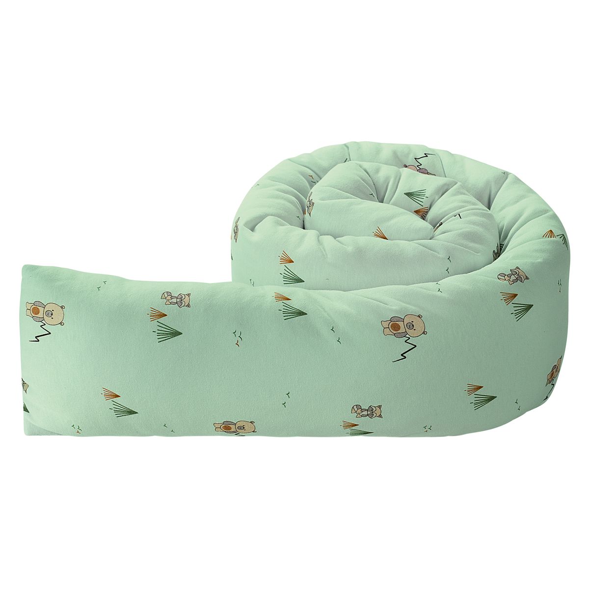 Die Nestchen-Rolle Jersey 165 cm - TwoFriends Greenery von Odenwälder sorgt für eine weiche Umrandung im Kinderbettchen und schützt das Köpfchen vor harten Gitterstäben und Kanten. Mit 165 cm ist sie vielseitig verwendbar und kann auch auf dem Wickeltisch, im Beistellbett, Laufgitter, Baby- und Kinderbett genutzt werden. Die Rolle hat eine wolkenweiche Füllung und einen Bezug aus reiner Baumwolle, die besonders sanft zur zarten Babyhaut ist. Verziert ist die Rolle mit kindgerechten Motiven, die Klein und Groß verzaubern. Bei Verschmutzungen lässt sich das pflegeleichte Nestchen ganz einfach in der Waschmaschine reinigen und anschließend in den Trockner geben. So ist es schnell wieder einsatzbereit.