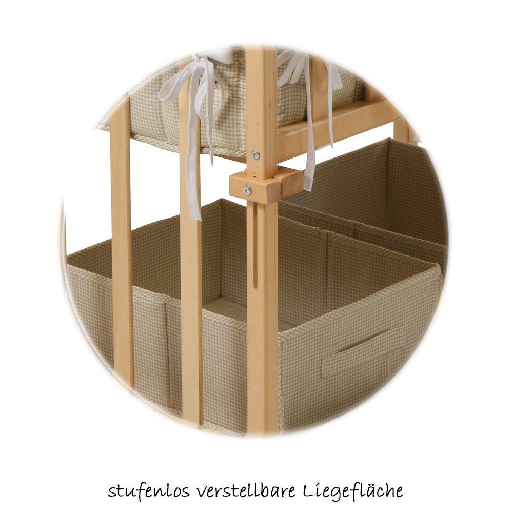 Das Roba Stubenbett 4 in 1 Babysitter Natur mit Zubehör - Liebhabär ist in den ersten Lebensmonaten deines Babys ein Ort der Geborgenheit. Zum Set gehören neben dem Stubenbett eine Matratze, ein kuscheliges Nestchen, Decke und Kissen, ein Himmel mit Himmelstange, ein niedliches Spielelement, 2 geräumige Stoffboxen sowie 2-teilige Bettwäsche im Design Liebhabär. Das Besondere: Du kannst das Stubenbett auch als Wiege (Kufen sind inklusive), als Beistellbett oder als gemütliche Kinderbank nutzen.
