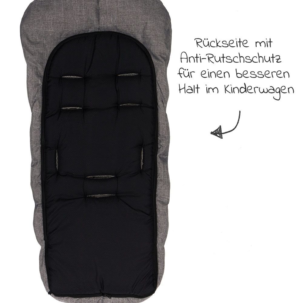 Du kannst den Fußsack einfach an fast jedem Kinderwagensitz oder Buggy befestigen. Dank der 8 Gurtschlitze, 4 Gurtschlitze für die Schultergurte, 2 Gurtschlitze für den Schrittgurt und 2 Gurtschlitze für den Beckengurt, passt er zu jedem 3- oder 5-Punkt-Gurtsystem. Eine großflächige Anti-Rutsch-Beschichtung auf der Rückseite, verhindert unangenehmes Verrutschen.