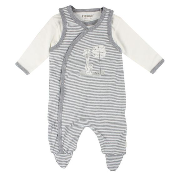 The 2-piece set Infinity Ringel Gray by Fixoni consists of an interlock romper and a long-sleeved body interlock. Both parts are made of pure, skin-friendly cotton. You can open and unfold the romper for easier dressing and undressing by means of snaps on the front down to the foot. Soft little feet keep your baby's toes nice and warm. The comfortable two-piece is decorated with stripes and a funny giraffe application. To pull underneath you get a matching bodysuit with long sleeves. This also has practical snaps in the crotch and on the shoulder.