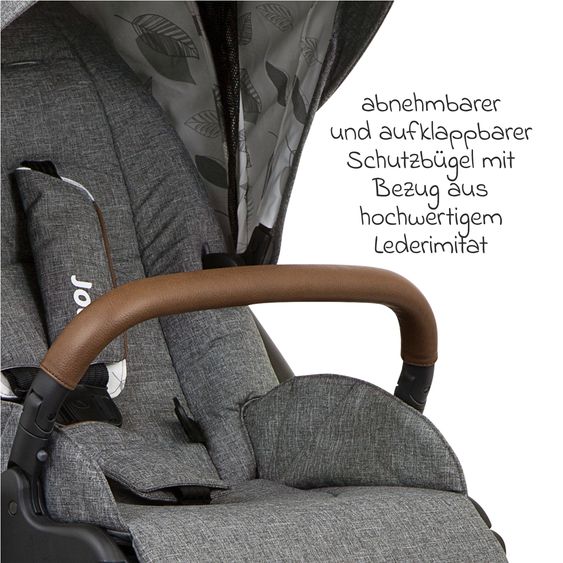 The large fold-out hood is equipped with UV protection 50+. For warm days, a ventilation window and side ventilation openings made of mesh fabric are provided. A safe ride is guaranteed by the 5-point harness with SoftTouch padding and the removable, foldable front bar covered in faux leather. If it suddenly rains on the way, your little one stays dry thanks to the rain cover.