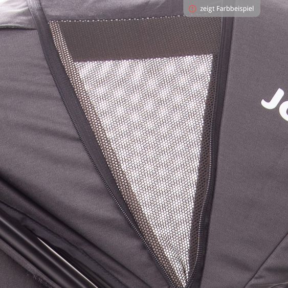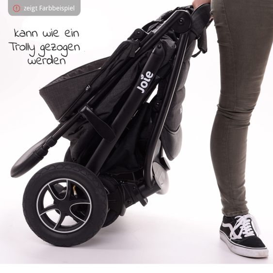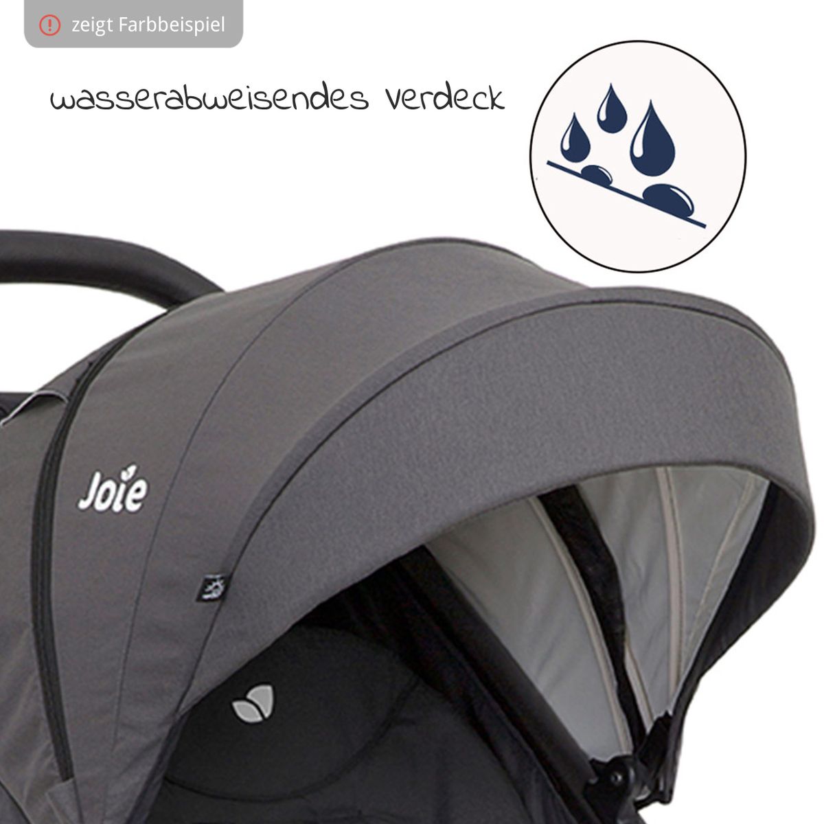 The Litetrax 4 - Gray Flannel st roller from Joie - 2022 Collection with slide storage compartment, rain and insect protection scores with features such as an extra-large canopy, full-suspension wheels and a backrest that can be adjusted up to the reclining position. If you compare it to its predecessor, you'll notice that it's equipped with even more durable fabrics that are now also water-repellent, so rain can't do much to them. In addition, compared to its predecessor, it has a noble slider made of imitation leather and an additional button in the middle of the seat, which makes the one-hand folding mechanism even safer. The set also includes a practical rain cover.