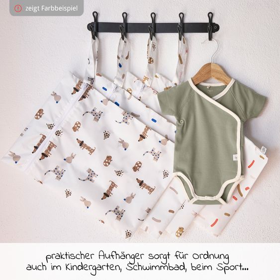The wet bag is opened with a zipper and the water-repellent material reliably keeps moisture sealed inside. Thanks to the side loop, it can be taken anywhere and hung up. With dimensions of 29 x 40 cm, it offers ample space. The material of the bags is BPA-free and machine washable at 40 °C.