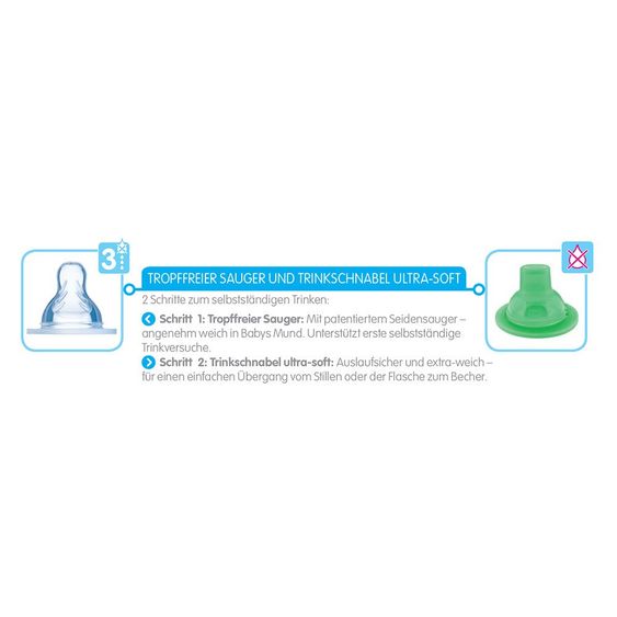 The Trainer+ drinking bottle from MAM is ideal for the transition between bottle and cup. Thanks to the practical handles, it fits well in small baby houses. Even children who do not want to use handles can hold the bottle well due to its wide shape and uneven surface. Another plus: The bottle is supplied with two tops. The nipple in the size 4 non-drip is well suited for the very first attempts at drinking, if your child is then safer, the also leak-proof ultra-soft drinking beak is used. The same applies to the protective cap, which you can also use as a measuring cup for milk powder.