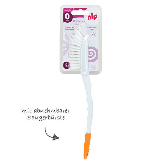 The bottle and teat brush 2in1 from Nip has a curved brush head - so you can clean even hard-to-reach areas of the baby bottle. The soft nylon bristles are gentle on the bottle. Thanks to the ergonomic handle, the brush lies well and securely in the hand.