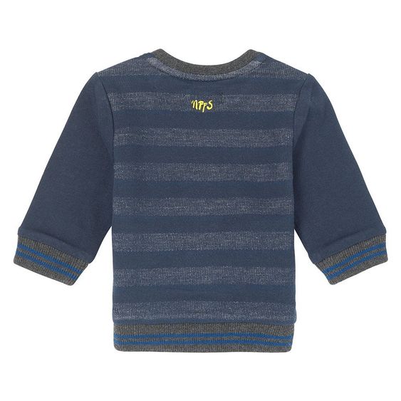 The sweatshirt Clanton in Navy Melange by Noppies is made of pure cotton. It has block stripes and a sophisticated embroidery in bright ocher yellow and white with loose thread ends on the front. The top with ribbed cuffs and round neckline can be opened on one shoulder for easier dressing and undressing. For this purpose, a decorative and a concealed snap button have been attached here.