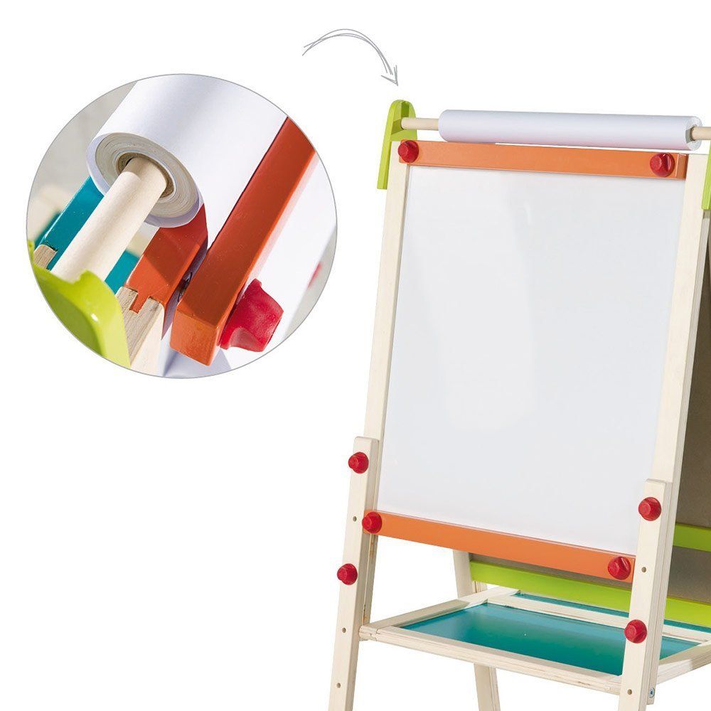 With the height-adjustable chalkboard with paper roll - fox & owl of Roba you get painting and writing fun in the nursery. Chalk is used on the green side. The practical lines help with the first writing attempts. The white magnetic side is the ideal surface for assembling magnetic letters. Chalk and pens can be stored in the compartment below. The paper roll can be pulled out and diligently painted. When the artwork is finished, simply cut it off. The blackboard is height adjustable and accompanies your child from the age of three.