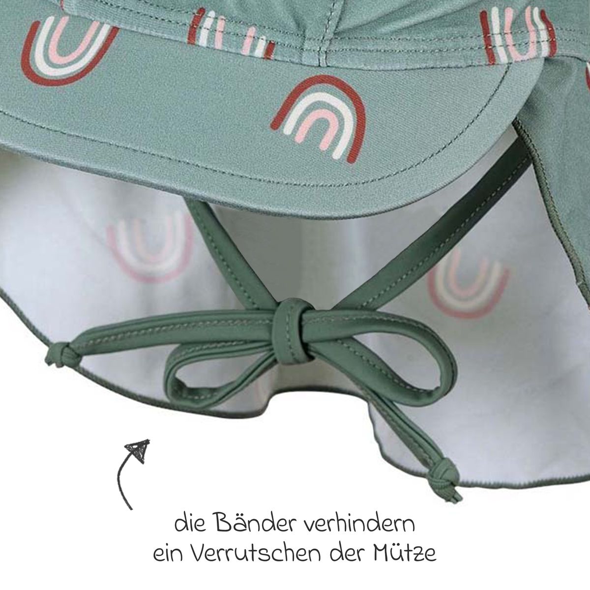 Children's and babies' skin in particular is very sensitive and more permeable than that of adults, so it should be well protected from the sun. The Sterntaler peaked cap with neck protection SPF rainbow in green is equipped with UV protection 50+ and long neck protection. This means that the delicate skin on the head and neck as well as the ears and eyes are very well shielded from the sun's rays.