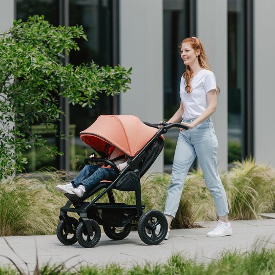 The frame of the Mono 4 combines a lightweight design with high stability. Thanks to the flexible push bar height of 76 to 124 cm, it adapts ergonomically to any height, while the 1-hand brake system with integrated hand and parking brake as well as disc brakes give you full control and immediate deceleration at all times. The individually sprung wheels and swivel and lockable front wheels make it easy to ride on any terrain and guarantee a smooth ride. The pneumatic tires can be adjusted to your needs via an adjustable air pressure, ideal for city strolls or sporty off-road excursions.