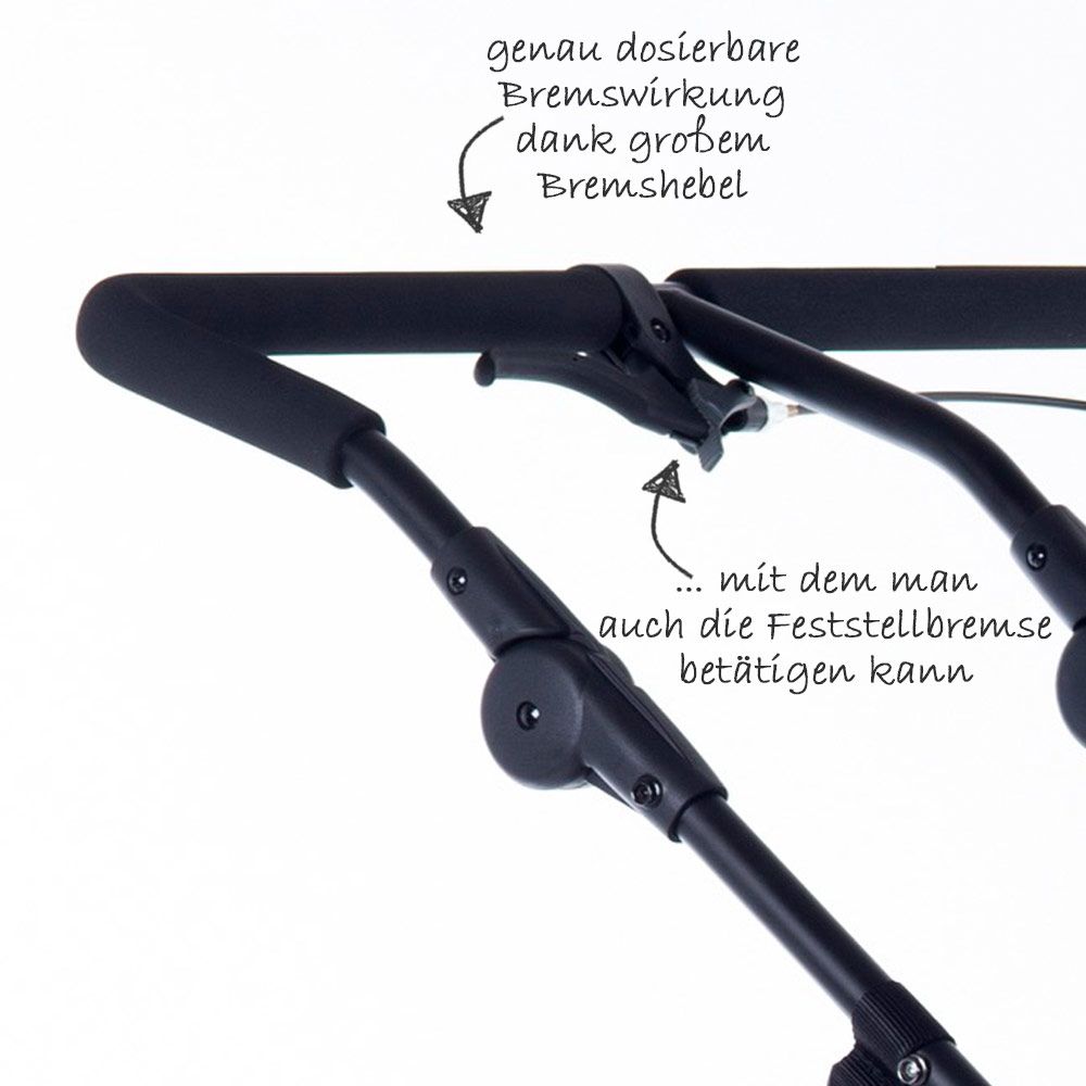 - Equipment: Aluminum frame, puncture-proof 12 inch (30.5 cm) air-chamber wheels from Solight Ecco, height-adjustable pusher with brake lever, suspension on rear axle, Weber Scheib enbremsen, breathable SitzflächeAirgo seat cushion with head and shoulder pads, 2 swivel and lockable front wheels, height-adjustable and padded 5-point harness, adjustable and removable safety bar, 2 zippered side pockets.