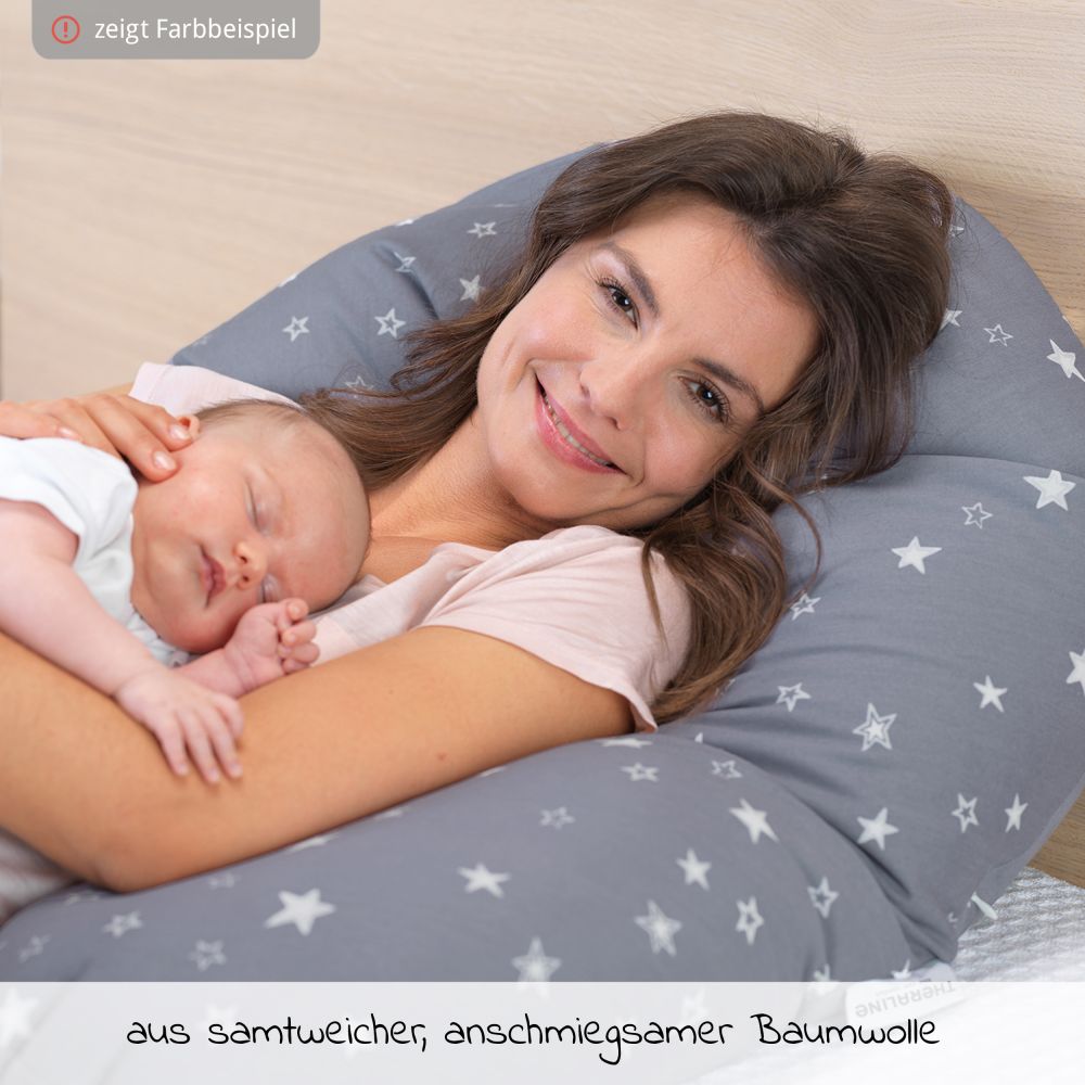 The Theraline nursing pillow cover was sewn to fit perfectly with velvety-soft, high-quality, preshrunk cotton. Special care was taken to ensure that you will enjoy it for a long time and that the pillow and cover are absolutely safe for your baby, which is why all materials used have been tested for harmful substances. The easy-care pillow and the cover can be machine washed at 60 ° C.