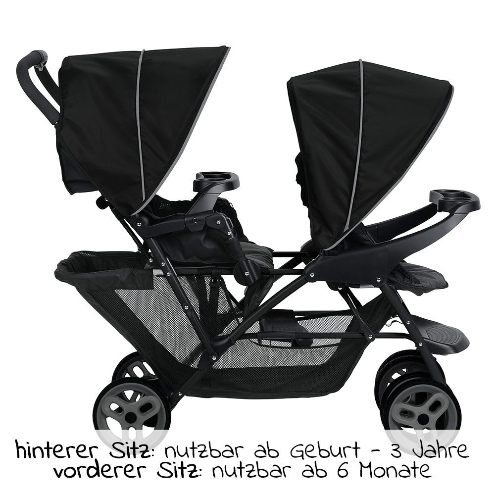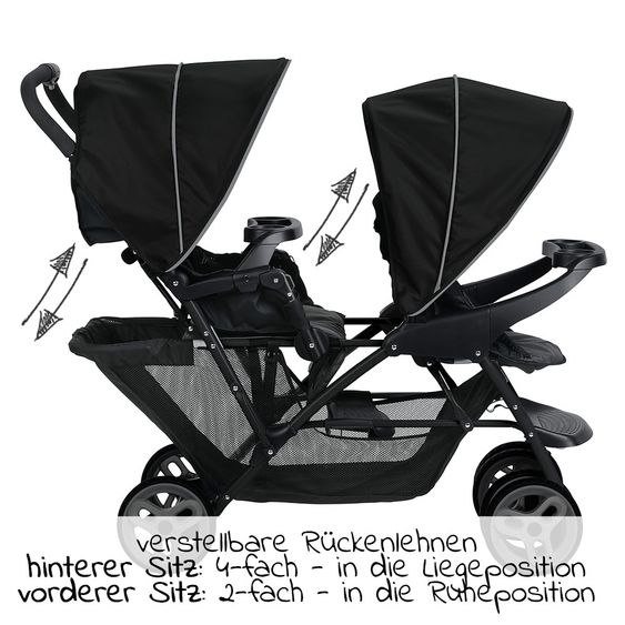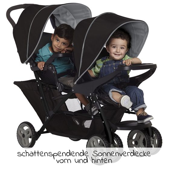 Il passeggino Graco Stadium Duo Sibling & Twin - Black Grey farà stare i tuoi bambini comodi per lunghi periodi di tempo. È compatto, poco ingombrante e poco ingombrante. È adatto a bambini di età diverse o a gemelli da quando sono seduti (circa 6 mesi) fino a 36 mesi. Grazie al leggero telaio in acciaio, il passeggino HOCO è uno dei passeggini tandem più leggeri, con un peso di soli 13 kg. È uno dei passeggini per fratelli più stretti e molto maneggevole grazie alle ruote piroettanti di facile scorrimento. La generosa imbottitura dei sedili e delle cinghie garantisce una seduta confortevole.