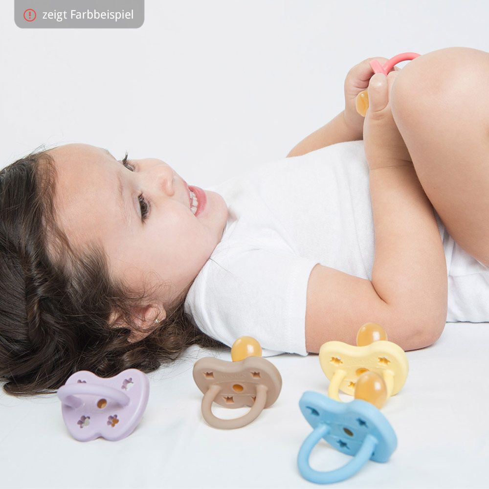 Il materiale in gomma naturale al 100% e pigmenti colorati naturali è liscio come la seta e piacevolmente morbido. Questo significa che il ciuccio è molto apprezzato, non lascia segni ed è delicato sulle gengive sensibili. Allo stesso tempo, è molto robusto e i piccoli denti da latte non possono danneggiarlo. La finitura senza cuciture rende il succhietto particolarmente igienico e può essere pulito con acqua calda.