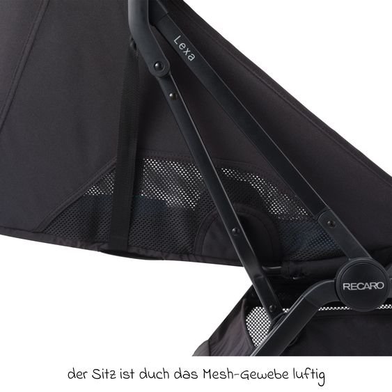 La Lexa è dotata di un sedile ben imbottito. I generosi inserti in rete permettono all'aria di circolare facilmente. Questo garantisce il comfort nelle giornate più calde. Ti permette di utilizzare il passeggino per brevi viaggi, anche per i bambini più piccoli. Lo schienale del sedile può essere reclinato in modo continuo per ottenere una posizione distesa e rilassata. Il bambino può appoggiare comodamente i piedi sul poggiapiedi. Una barra di sicurezza imbottita e il sistema di cinture a 5 punti assicurano una presa sicura del seggiolino.