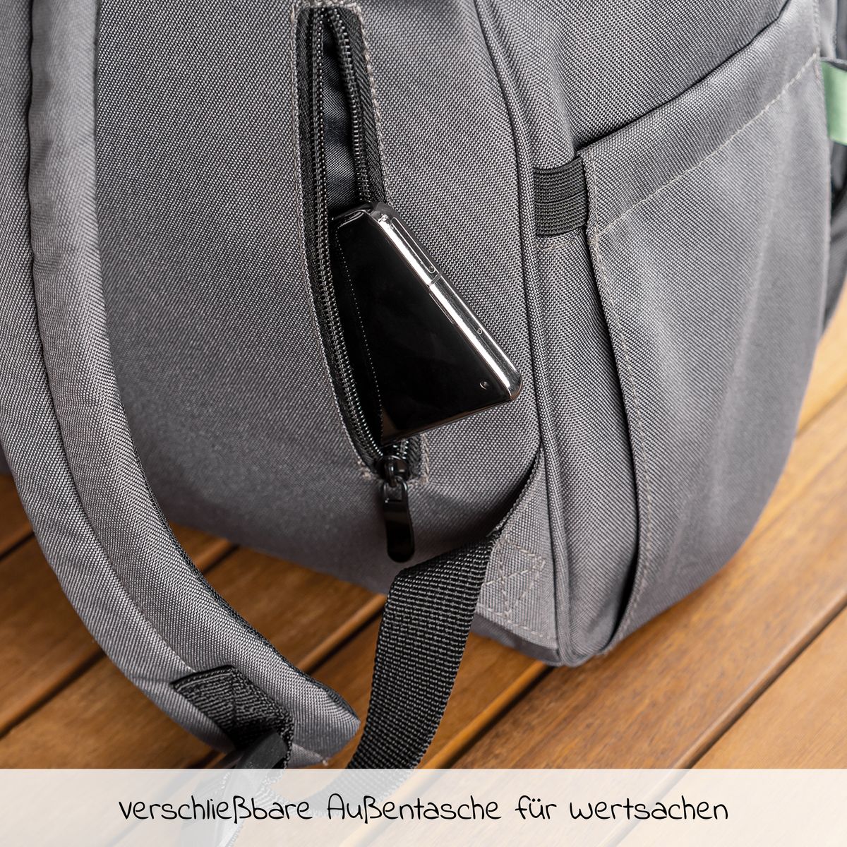 L'ampio scomparto esterno è isolato e dispone di due tasche per i biberon. In caso di fuoriuscita, un altro scomparto esterno con un'ulteriore apertura per una facile rimozione contiene le salviette umidificate. Gli oggetti importanti come il portafoglio, il cellulare o le chiavi possono essere riposti nello scomparto a prova di furto sul retro. Anche il cambio del pannolino in viaggio è un gioco da ragazzi: lo zaino contiene un fasciatoio che può essere utilizzato in qualsiasi momento.