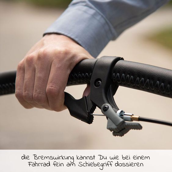 Lo scivolo in similpelle è regolabile in altezza fino a 122 cm. Questo rende il Duo il passeggino ideale per i genitori alti. La leva del freno a spinta è pratica e sicura. Puoi usarlo per ridurre la velocità al punto giusto durante il viaggio. I potenti freni a disco fermano la Duo in modo affidabile, anche nelle discese più ripide o sul bagnato. Quando sei fermo, puoi anche usare la leva del freno per azionare il freno di stazionamento. È molto utile sui terreni in pendenza e anche sui mezzi pubblici.