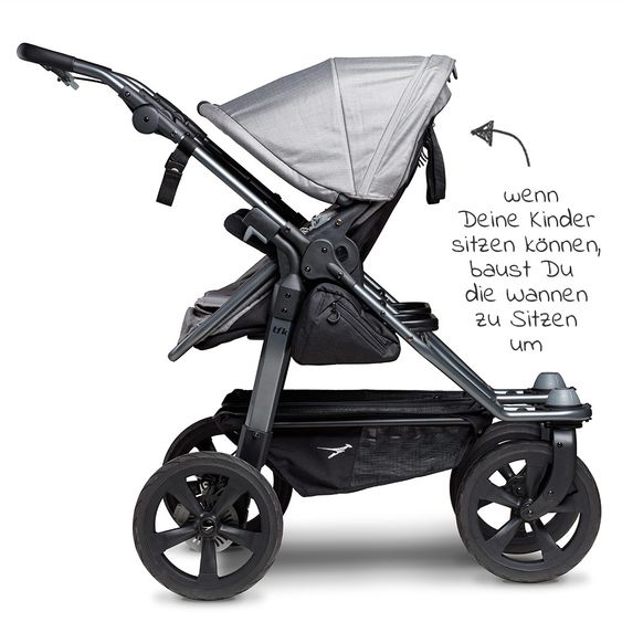 È un mezzo tuttofare affidabile e può essere utilizzato su quasi tutti i terreni grazie alle grandi ruote a camera d'aria da 12 pollici (30 cm) a prova di foratura. La station wagon fa una bella figura non solo durante le escursioni, ma anche quando si passeggia in città. Il comfort dei bambini e dei genitori è una priorità assoluta, fin dall'inizio. Il set comprende due vasche convertibili. Queste innovative unità combinate (vasca e seduta) con materassi comfort sono tra le più grandi del mercato. Puoi indossarli in direzione di marcia o contro di essa e trasformarli in sedili sportivi a tutti gli effetti con cintura a 5 punti. Questo significa che anche i piccoli passeggeri che possono già sedersi in modo indipendente possono contare su un buon rapporto qualità-prezzo.