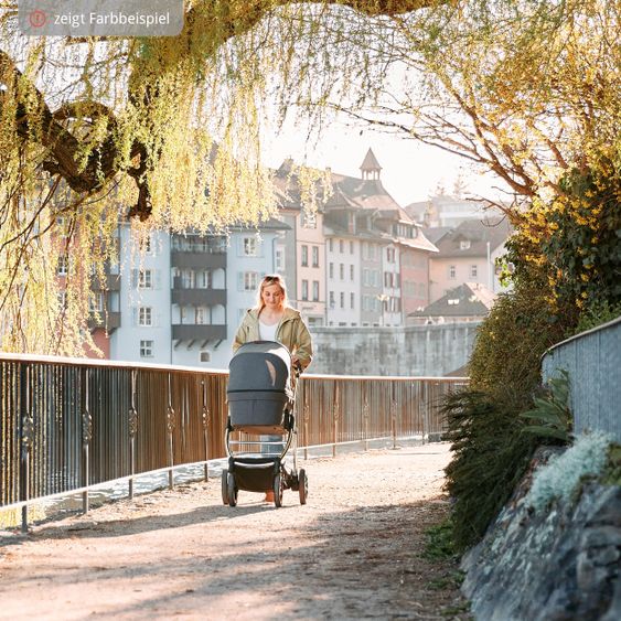 - Ausstattung: Babywanne mit Matratze und großem Sonnenverdeck, Sportwagensitz mit flacher Liegeposition, ausklappbarem Verdeck, gepolstertem 5-Punkt-Gurt, abnehmbarem Schutzbügel, kugelgelagerte und pannensichere All-Terrain Luftkammerräder, zentrale Federung, höhenverstellbarer Schieber