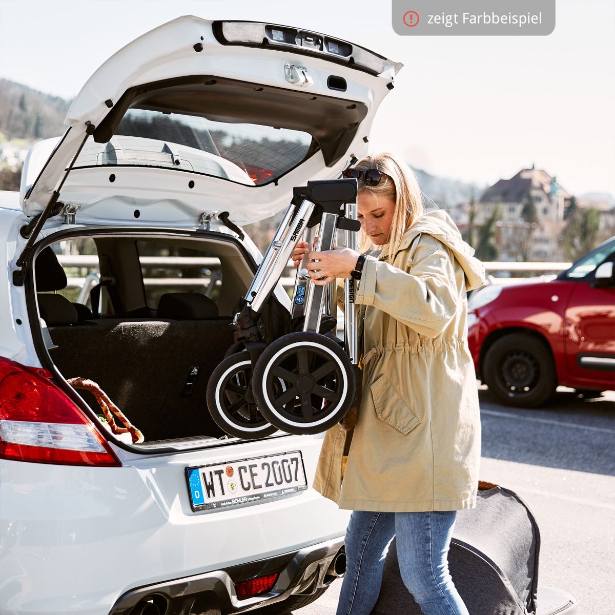 Der Samba fährt auf großen All-Terrain Luftkammerrädern. Pannenfest und laufruhig kurven die 4 Räder durch enge City-Passagen und holprige Waldwege. Auf besonders unebenem Gelände stellst Du das Vorderrad fest, so blockiert es nicht und Du kommst zügig voran. Neben den weichen Rädern, sorgt die im Rahmen integrierte Federung für die Dämpfung kleiner und großer Stöße. Nach der Tour klappst Du den Wagen schnell und einfach zusammen. Das besondere beim ABC Design Samba ist, dass Du den Sitz beim Falten einfach montiert lassen kannst. Für ein besonders kleines Klappmaß kannst Du zusätzlich die Räder abnehmen. Das geht supereasy per Knopfdruck. So bekommst Du den Samba auch in den kleinsten Kofferraum.