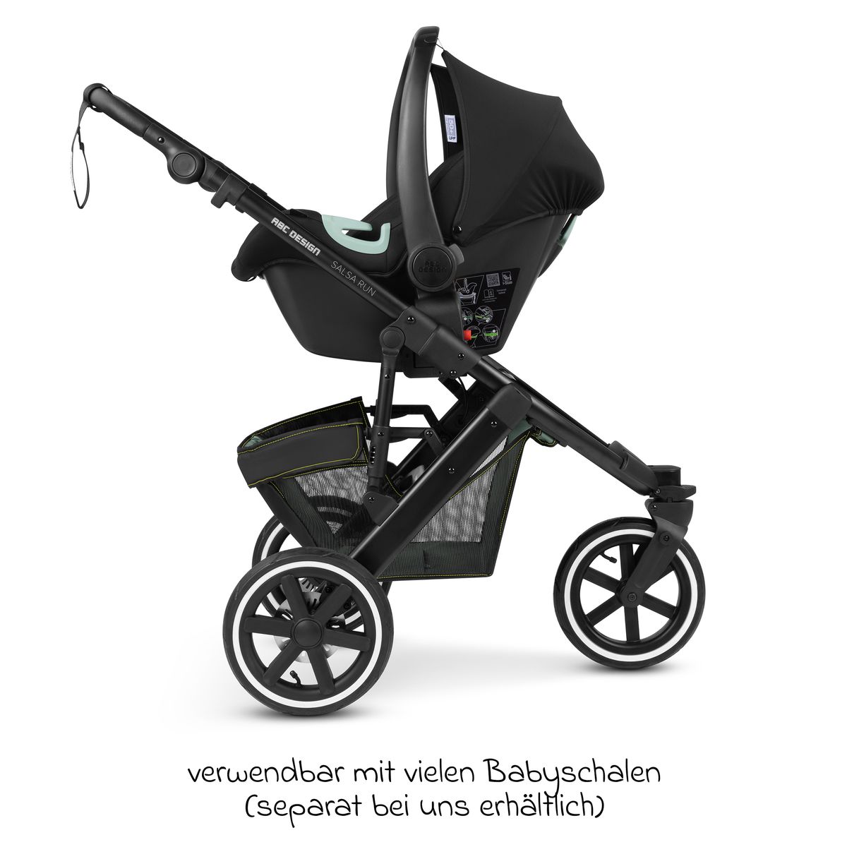 Hinweis: Den Salsa Run kannst Du mit separat erhältlichen Adaptern (in unserem Shop) mit vielen Babyschalen und Autositzen kombinieren. Dies bietet den Vorteil, dass Du Dein Baby bspw. für den Einkauf nicht wecken musst, sondern einfach die Babyschale auf das Kinderwagengestell klickst.