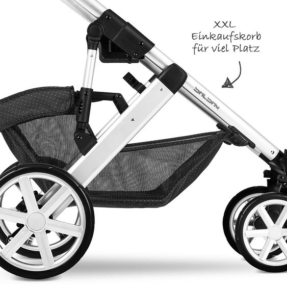 - Ausstattung: Babywanne mit Matratze und großem Sonnenverdeck, Sportwagensitz mit flacher Liegeposition, ausklappbarem Verdeck, gepolstertem 5-Punkt-Gurt, abnehmbarem Schutzbügel, kugelgelagerte und pannensichere Luftkammerräder, zentrale Federung, höhenverstellbarer Schieber