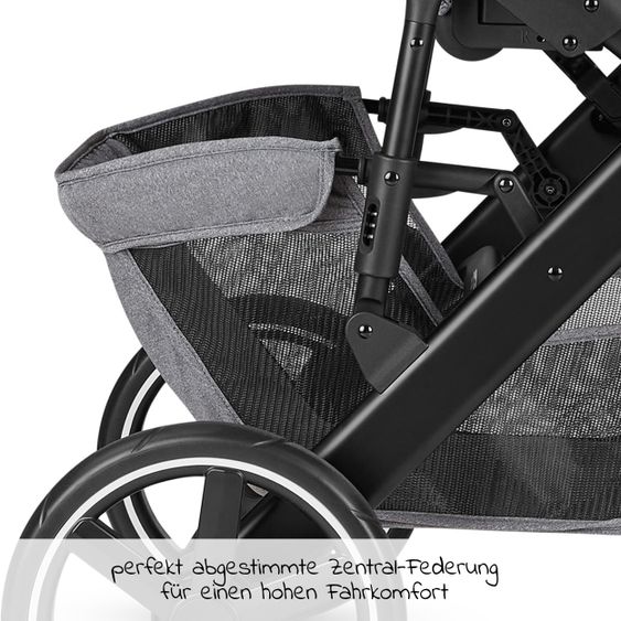 - Ausstattung: Babywanne mit extra weicher, keilförmiger Matratze mit erhöhtem Rand im Kopfbereich und großem Sonnenverdeck, Sportwagensitz mit flacher Liegeposition, ausklappbarem Verdeck, gepolstertem 5-Punkt-Gurt, abnehmbarem Schutzbügel, kugelgelagerte und pannensichere Luftkammerräder, zentrale Federung, höhenverstellbarer Schieber