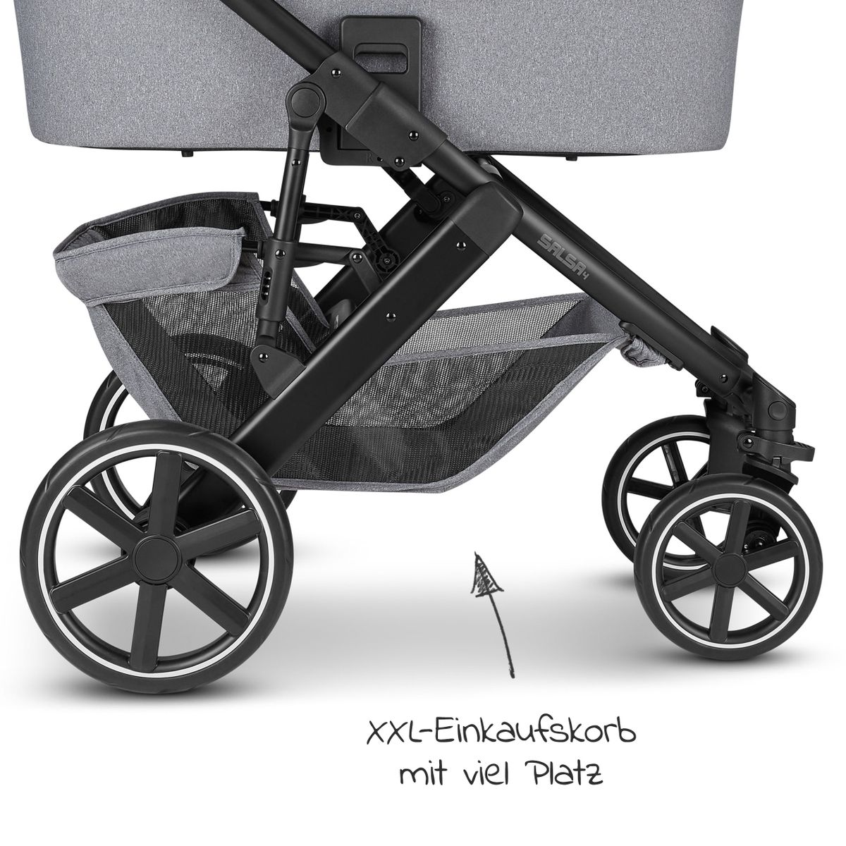 Bestens untergebracht geht es auf Tour. Dabei hat der Salsa 4 auch für Eltern ein paar Highlights. Der Schieber ist höhenverstellbar und ermöglicht Mama und Papa Spazierfahrten in bequemer Körperhaltung. Der Salsa ist auch für sehr große Eltern geeignet, da er zwischen den Hinterrädern enorm viel Beinfreiheit bietet. Noch mehr Erleichterung im Alltag bietet der super geräumige Einkaufskorb. Hier kannst Du sperrige und schwere Sachen unterbringen und sparst so Kraft und Nerven.