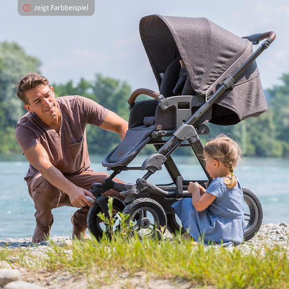 Sobald Dein Baby sitzen kann und mehr von der Umgebung sehen möchte, klickst Du einfach die Sportwagensitzeinheit in oder gegen Fahrtrichtung auf das leichte Aluminium-Gestell. Mit den schwenk- und feststellbaren Vorderrädern meisterst Du jeden Parcours und fährst genauso gut über holprige Feldwege wie über Kopfsteinpflaster. Die Federung am Gestell und die großen Lufträder gleichen Unebenheiten aus und sorgen für eine ruhige Fahrt auf jedem Gelände.