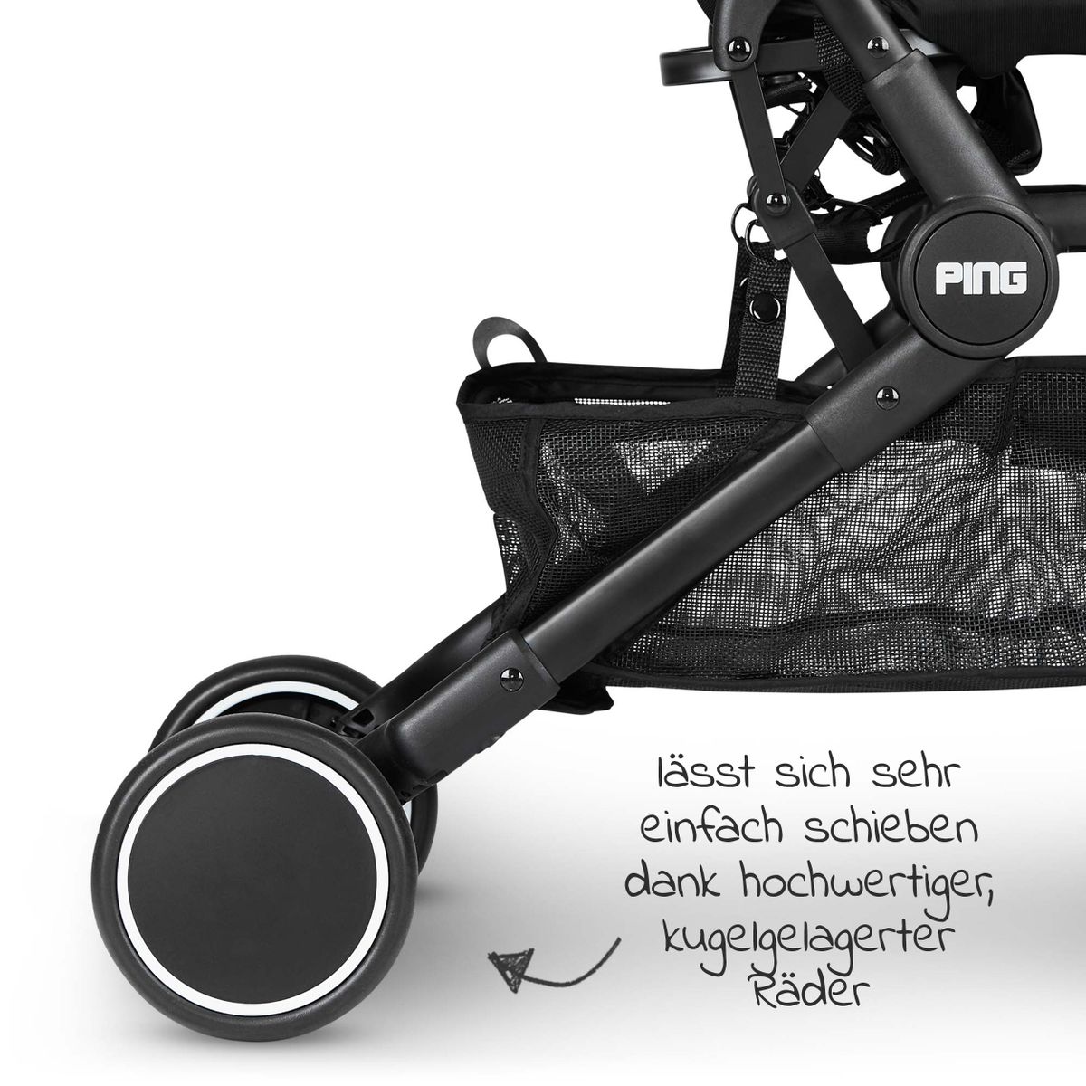 Der Reisebuggy Ping - Coal von ABC Design eignet sich ideal für aktive Familien. Wenn Du viel unterwegs bist, wirst Du den Ping lieben. Durch seine sehr kompakte und leichte Bauweise wird er nie zur Belastung. Egal ob Du mit dem Auto, Flugzeug, Bus oder Bahn unterwegs bist, für den Buggy findest Du immer einen Platz. Dabei bleibt der Komfort nicht auf der Strecke. Der Ping steht wesentlich schwereren Modellen in nichts nach. Neben einer komfortablen Liegeposition bietet er ein großes Verdeck mit UV-Schutz. Die vier pannensicheren Weißwand-Reifen sehen nicht nur gut aus, sondern sind dank Einzelrad-Federung auch sehr komfortabel. Im Handumdrehen kannst Du den Reisebuggy mit einer Hand falten und mit dem praktischen Gurt super bequem tragen.