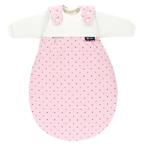 Das ALVI Baby-Mäxchen® besteht aus drei Schlafsäcken und bildet so ein praktisches System, das je nach Raumtemperatur angepasst werden kann. Der rosa Außensack mit süßem Herzchen-Muster ist leicht wattiert und in mitwachsender Doppelgröße. Die zwei Innensäcke in zwei aufeinanderfolgenden Größen sind mit langen Ärmelchen und anschmiegsamen Bündchen für eine hervorragende Passform ausgestattet. Werden die Nächte im Sommer wärmer, kann auch nur der Innensack verwendet werden.