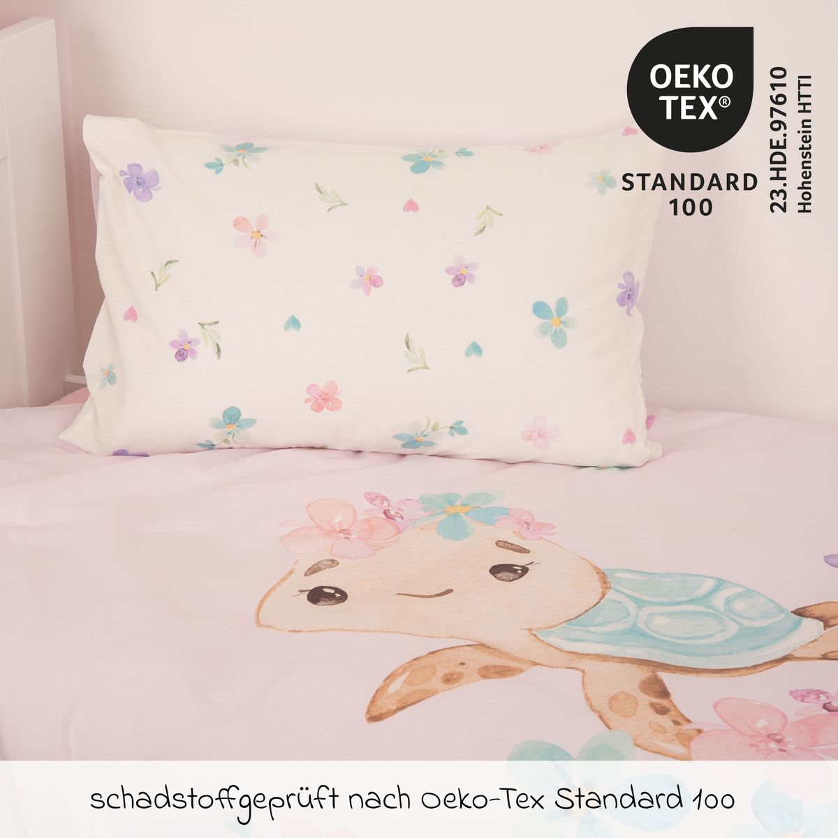 Neben dem Wohlfühlfaktor überzeugt die Bettwäsche ebenso mit zwei unterschiedlichen Seiten: Mit niedlicher Schildkröte und Blümchen gestaltet, wird sie schnell zu einem süßen Hingucker. Mit der Wendebettwäsche hat Dein kleiner Schatz die freie Wahl, welche Seite heute oben zu sehen sein soll. Sie ist außerdem ideal als Geschenk zum nächsten Kindergeburtstag geeignet.