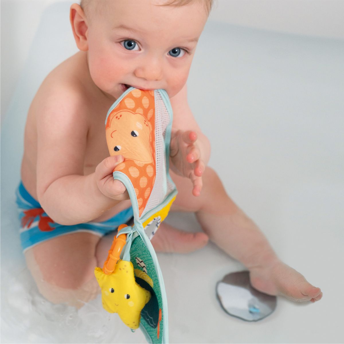 Das regelmäßige Babybad macht nicht jedes Mal so viel Spaß, aber mit dem aufklappbaren Badebuch U-Boot - Plansch & Play von Fehn hat Dein kleiner Weltentdecker eine spannende Beschäftigung in der kunterbunten Meereswelt. Beim Durchblättern des Buches wird Dein Baby viele neue Badefreunde kennenlernen. Das Raschelpapier, ein Spiegel und ein versteckter Beißring hinter der Folie fördern spielerisch seine Sinne und die Fantasie.