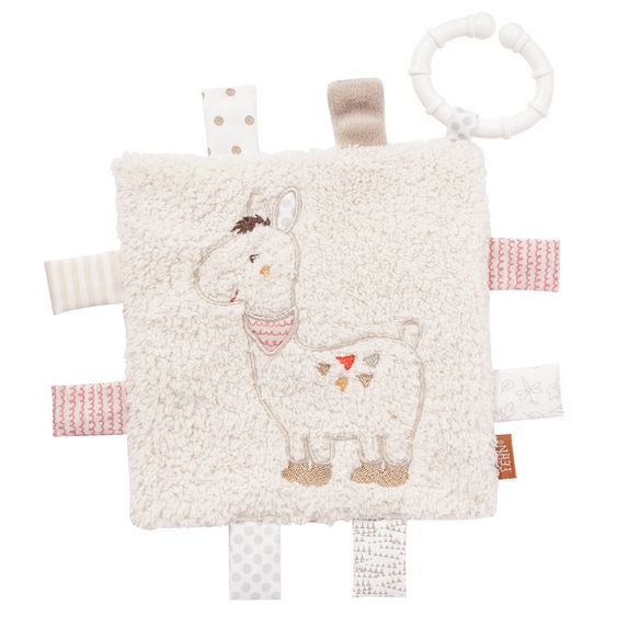 Lustiger Spielspaß ob Zuhause oder unterwegs: Mit dem praktischen Ring kann das Knistertuch Lama von Baby Fehn an Kinderwagen, Babyschale oder Bett befestigt werden. Die verschiedenen Spielmöglichkeiten sorgen überall für gute Laune – Raschelpapier, Quietsche und die vielen Greifelemente regen die Neugier an und fördern Babys Greif- und Tastsinn sowie die Feinmotorik. Das geschmeidige Material aus Bouclette, Softvelours, Stoff sowie das niedliche Lama Design sorgen für kuscheliges Spielen & Erkunden, damit wird das Knistertuch sicher zum treuen Begleiter ob Zuhause oder auf Reisen.
