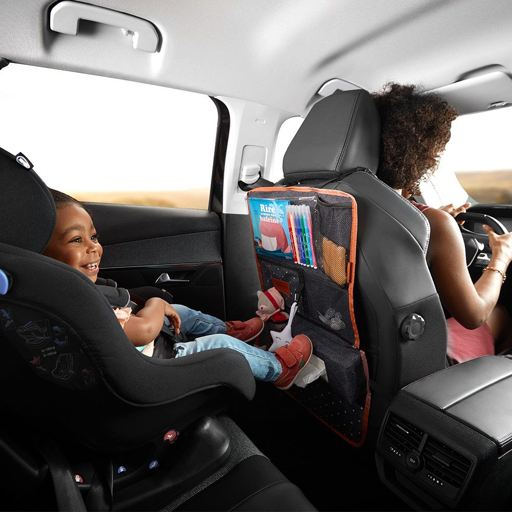 Dank stufenlos längenverstellbarer Befestigungsriemen mit Klick-Verschlüssen lässt sich der Organizer ganz leicht an jedem Autositz anbringen. Die vielen unterschiedlichen Fächer und Taschen bieten ausreichend Platz für Spielsachen, Bücher, Malstifte und mehr. Ein Fach ist speziell für Pflegetücher, damit Du diese immer schnell zur Hand hast. Das transparente Fach lässt sich super als Tablethalter verwenden - so kann Dein kleiner Schatz auf besonders langen Fahrten seine Lieblingssendung sehen. Daneben befindet sich ein elastisches Netzfach für Fläschchen und Getränke. Ein Karabiner in der Mitte des Organizers bietet Dir die Möglichkeit etwas einzuhängen.