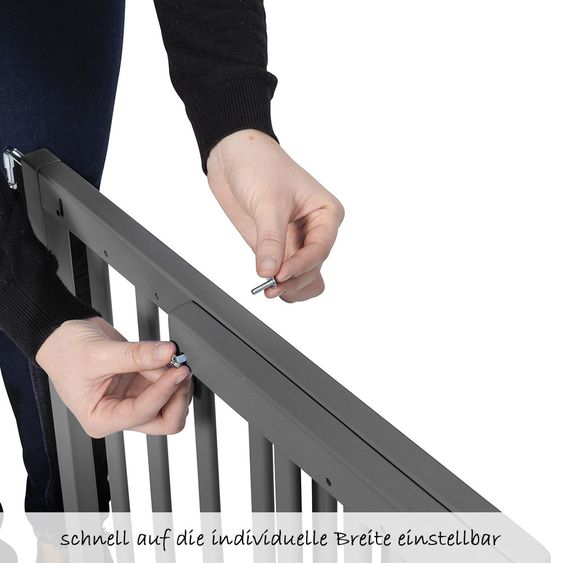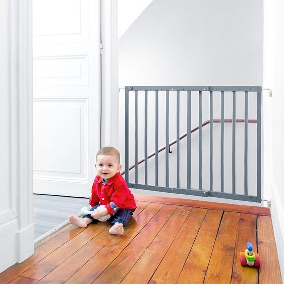 Das Schutzgitter aus Holz in Grau aus der Linie Color Pop von Badabulle schützt Dein Kleines vor den Gefahren in verschiedenen Zimmern oder vor steilen Treppen. Das Gitter kann an Türrahmen mit einer Breite von 63 bis 103,5 cm befestigt werden. Somit sind auch schnell etwas breitere Türen gesichert. Je nach Breite Deiner Tür kannst Du das in sich zusammengeschobene Gitter auf die passende Breite ausziehen. Nach dem schnellen Zusammenbau kann es in die von Dir an den Türstock geschraubten Halterungen eingehängt werden.