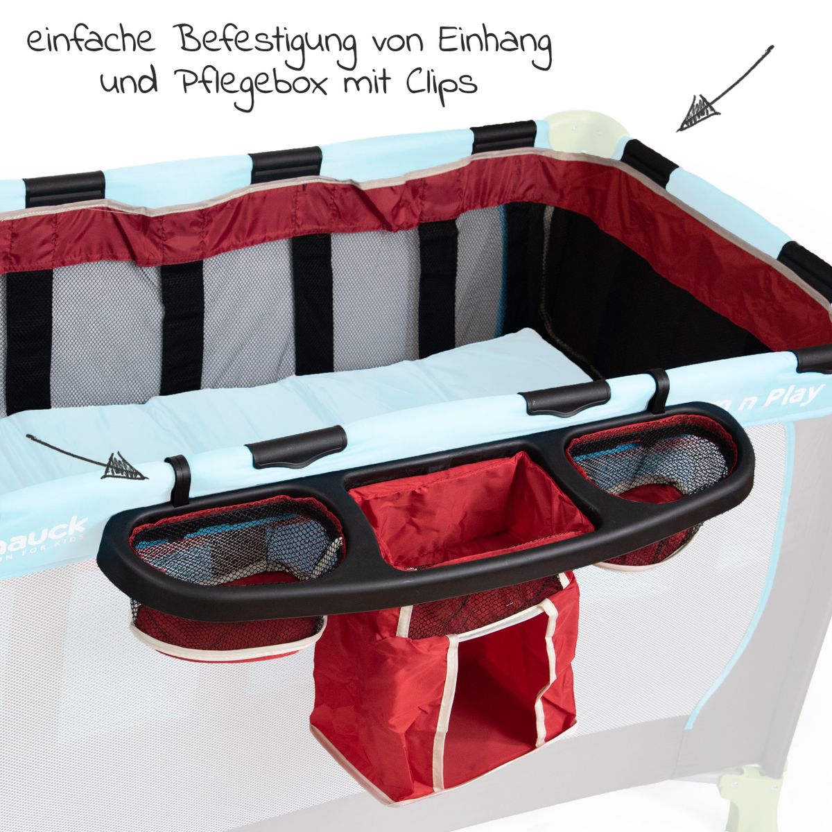 Reisebett-Einhang mit der Clipbefestigung am Rand des Reisebetts anbringen. Ihr Baby liegt so etwas erhöht im Reisebett und Sie schonen beim Hineinlegen und Herausnehmen des Babys Ihren Rücken.