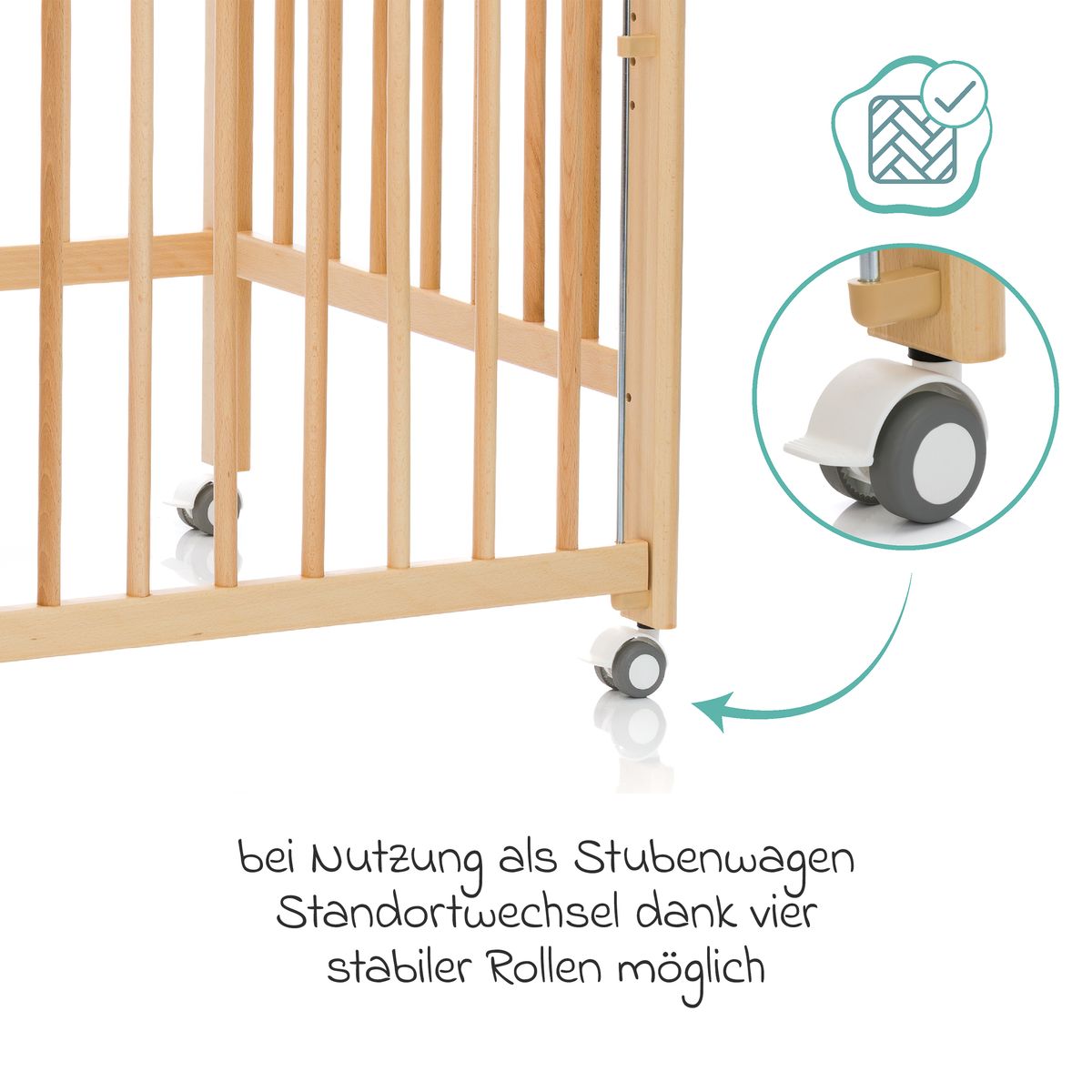 Das Beistellgitterbett ist flexibel einsetzbar: Dank der vier leichtgängigen und feststellbaren Rollen kannst Du es mühelos im Raum bewegen und optimal positionieren. Der mitgelieferte Lattenrost aus Buchenholz sorgt für zusätzlichen Komfort und Stabilität, sodass Dein Baby sicher und geborgen schlafen kann.