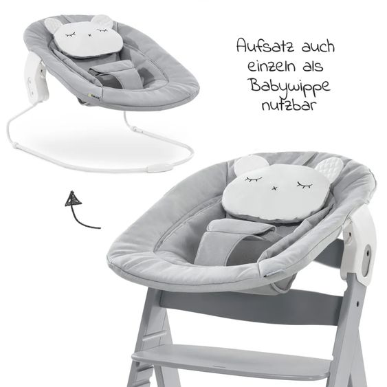 4in1 Paket: Inkl. Alpha Hochstuhl, Neugeborenenaufsatz und Babywippe sowie einem weichen Sitzpolster.
