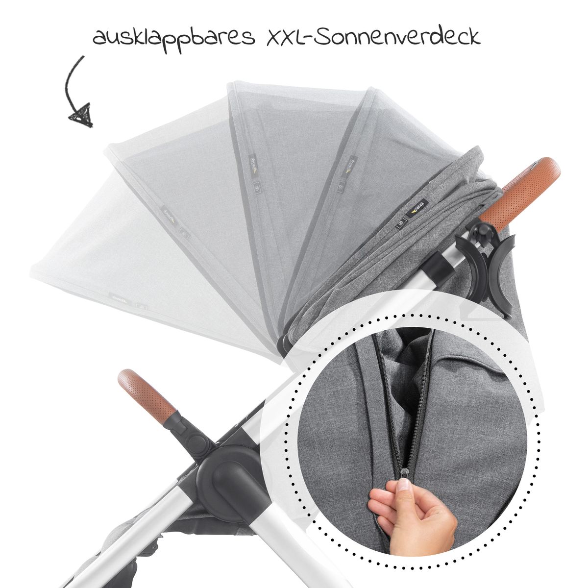 Als zuverlässiger Sonnenschutz lässt sich das verlängerbare 3-Zonen-Verdeck mit UV-Schutz 50+ nach vorne klappen. Damit es darunter nicht so warm wird und die Luft angenehm bleibt, kannst Du das praktische Belüftungsfenster öffnen. Wird es regnerisch, sorgt der Zamboo Regenschutz für Trockenheit. Lästige Fliegen oder Mücken werden zuverlässig vom Insektenschutz ferngehalten.