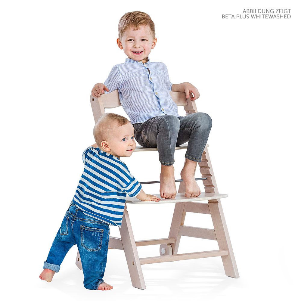 Im Treppenhochstuhl Beta Plus ist Ihr Kind zu jeder Mahlzeit gut aufgehoben! Er wächst gemeinsam mit Ihrem Kind und begleitet Sie so über viele Jahre. Durch seine hohe Belastbarkeit von 90 kg können sogar Erwachsene auf ihm Platz nehmen.