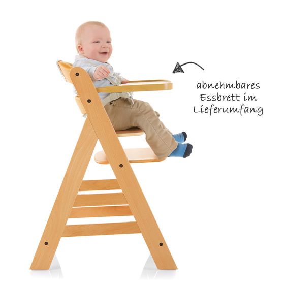 Der Hochstuhl Gamma Plus wird mit einem Essbrett sowie der Sitzauflage Deluxe geliefert. Auf dem großen Essbrett kann Ihr Kind an seinem eigenen Tischchen essen oder spielen. Wenn Sie lieber alle zusammen an einem Tisch essen möchten, dann können Sie das Essbrett einfach entfernen. Sollte beim Füttern mal etwas daneben gehen, können Sie das Holzbrett schnell und einfach abwischen.