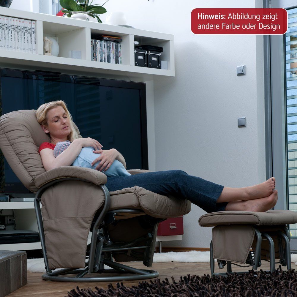 Sessel und Hocker sind mit einer angenehmen Schaukelfunktion ausgestattet, die Ihnen ein entspanntes Stillen ermöglicht. Darüber hinaus lässt sich die Rückenlehne stufenlos bis in die Ruheposition verstellen. Deshalb ist der Sessel auch ideal zum Entspannen am Abend, als Fernseh- oder Lese-Sessel. Die Polster bestehen aus Kunstleder bzw. haben eine Lederoptik. Sie sind pflegeleicht und abwaschbar.