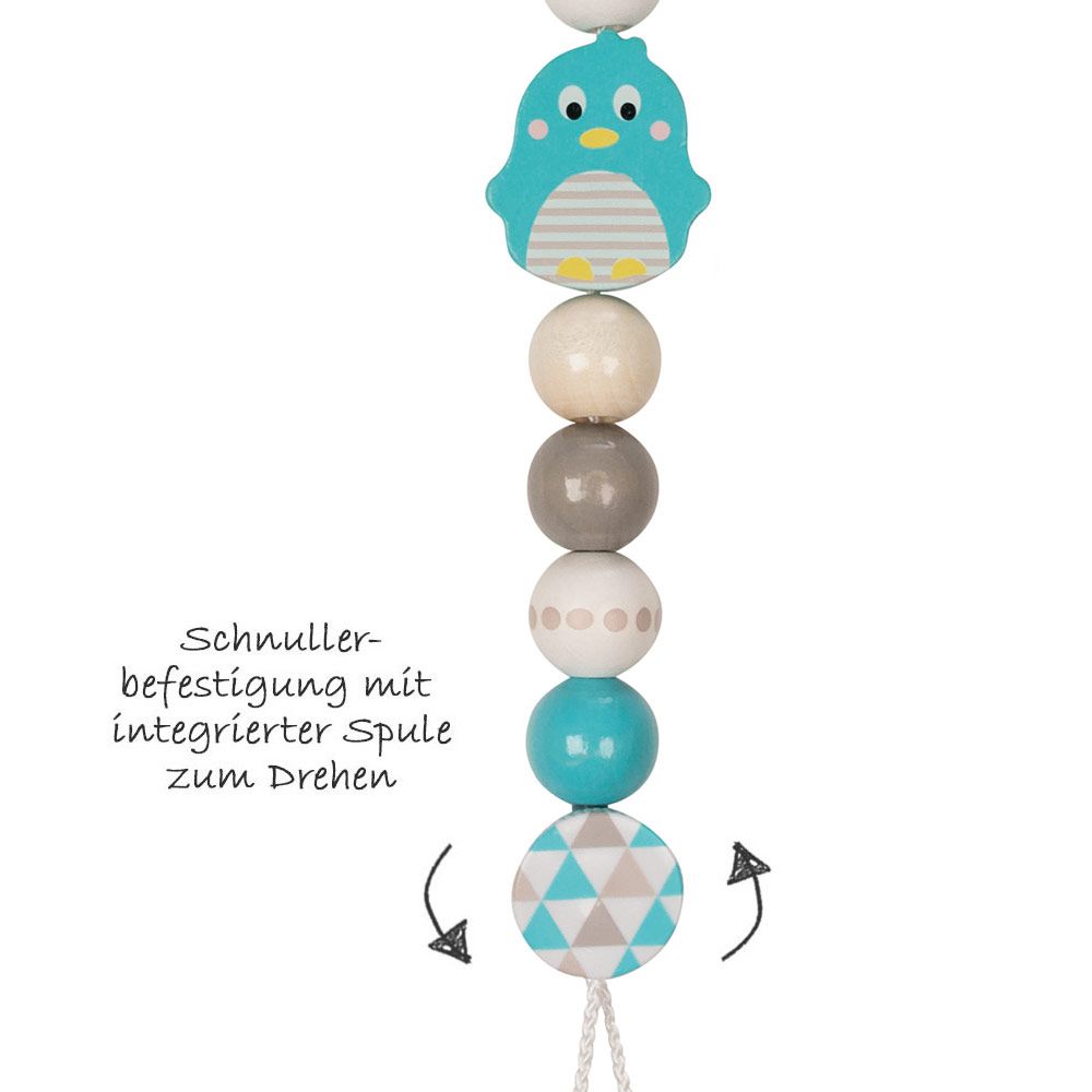 Mit der süßen Holz-Schnullerkette Pinguin von Heimess geht der Schnuller Deines Babys nicht mehr verloren. Sie ist für Schnuller mit und ohne Greifring geeignet. Zur Befestigung musst Du einfach an der integrierten Spule drehen, schon passt sich die Schlaufe entsprechend an. Anschließend kannst Du die bunte Schnullerkette mit dem Clip auf der anderen Seite an der Kleidung Deines Kindes oder am Kinderwagen befestigen. So fällt der Schnuller nicht mehr auf den Boden und wird schmutzig oder verschwindet einfach spurlos.