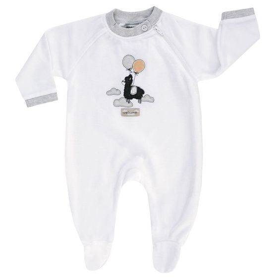 Mit dem praktischen Nicki Overall Lama in Offwhite mit Grau von Jacky ist Dein Baby im Handumdrehen kuschelig warm angezogen. Öffnen und verschließen lässt sich der Einteiler mit einem seitlichen Reißverschluss und einem Knopf am Rundhalsausschnitt. Die weichen Füßchen sorgen dafür, dass die kleinen Zehen nicht frieren. Hübsche Hingucker sind der Kontrastsaum und die süße Lama-Applikation auf der Brust.